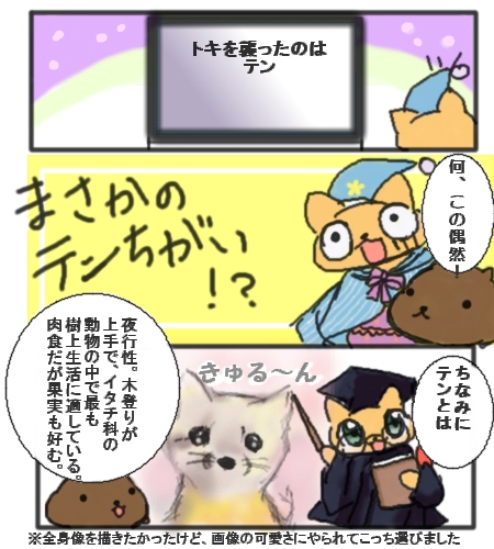 ミニテンネコはトキを襲った犯人のテンをまじまじ見ています。