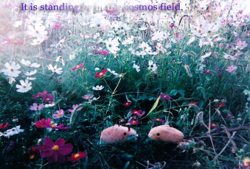 コスモス畑で2匹のカピバラさんはどう観て回ろうか話し合っています。