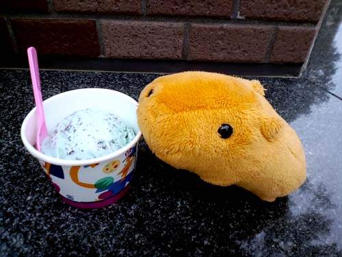 カピバラさんは可愛らしいちっちゃい服の上にのっかりました。天使の絵がついてますよ