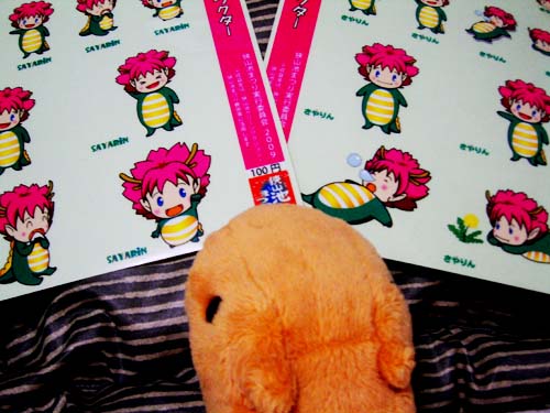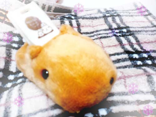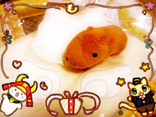 カピバラさんは可愛らしいちっちゃい服の上にのっかりました。天使の絵がついてますよ